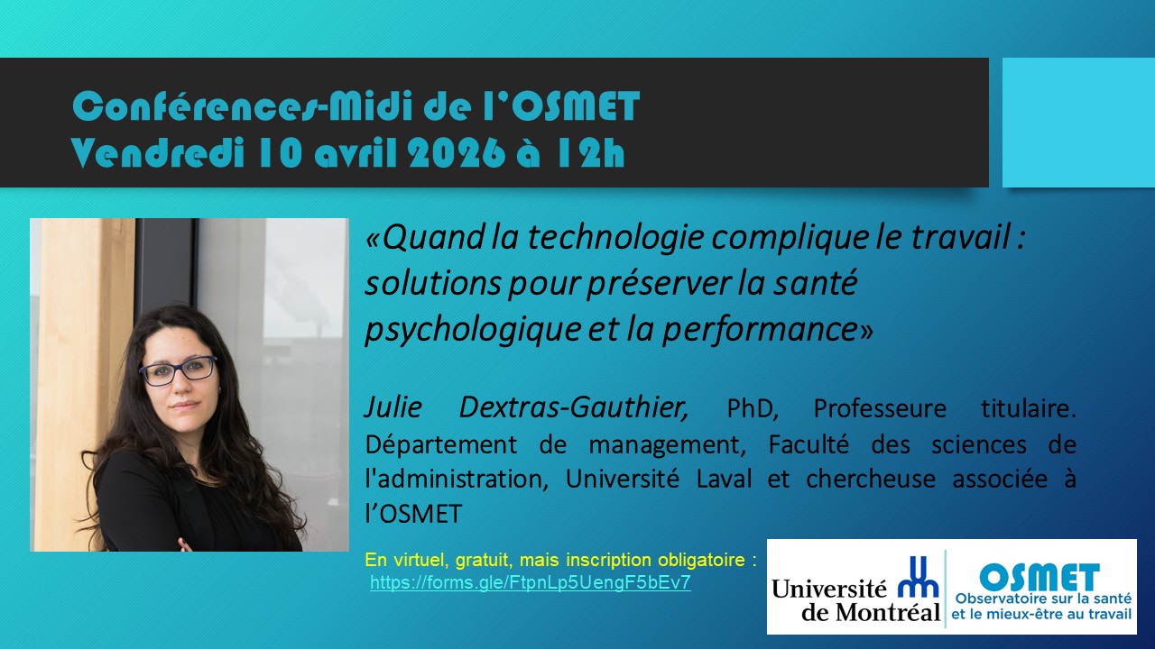 L’OSMET vous invite à une nouvelle Conférence-Midi pour vous faire découvrir une recherche novatrice en santé et mieux-être au travail, inscrivez-vous en remplissant le formulaire ICI