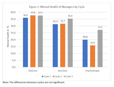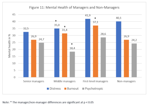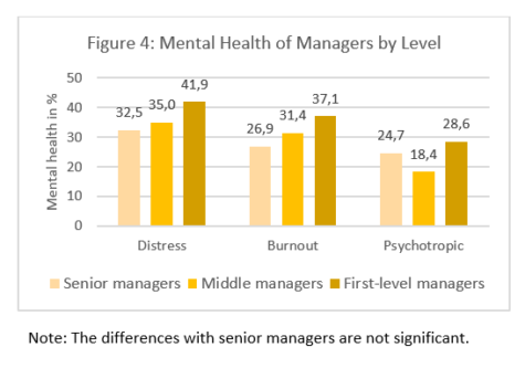- Psychological distress and burnout affect between 31.1%-37.8% of managers and 16.0%-27.2% use psychotropic medications;
