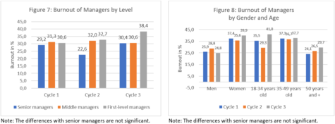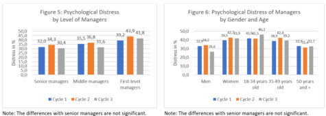 Mental health problems among managers are important and women are more seriously affected than men are. In addition, older managers tend to be less affected by problems of psychological distress and consumption of psychotropic medications. We observe some signs of increase over time but, overall, these issues remain relatively steady between 2019-2023. The extent of psychological distress is similar to that of non-managers, but burnout is more common among managers.