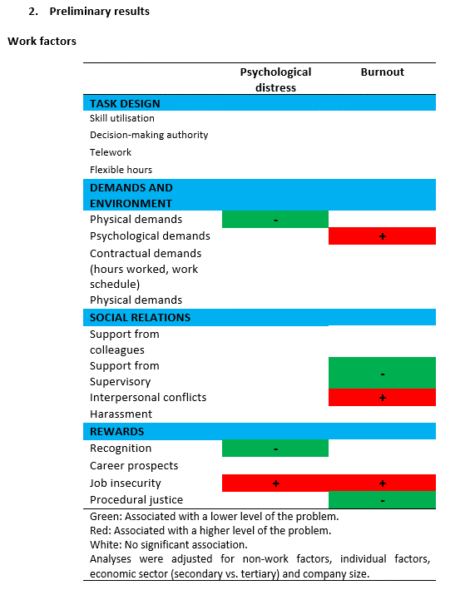 - In the workplace, having more physical demands, counting on the support of supervision, being recognised for the work accomplished and working in an organisation whose practices and procedures are based on principles of justice, appear to be favourable factors in protecting the mental health of individuals. However, psychological demands such as workload, work pace, conflicting demands, interpersonal conflicts, as well as job insecurity are associated with higher mental health symptoms.