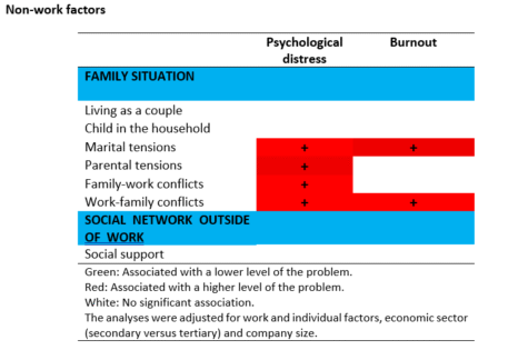 - Outside the workplace, the greater the tension with the spouse and children, and the greater the difficulties in balancing the demands of work and family, the more fragile mental health appears to be. Work-family conflicts appear to be the only significant factor in burnout.