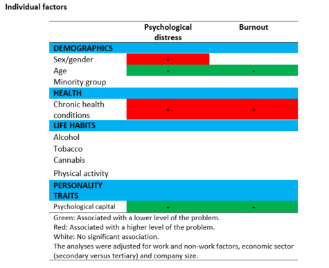 - Psychological distress and burnout: Contribution of work, non-work, and individual factors. October 2021. https://www.osmet.umontreal.ca/flash-recherche-detresse-psychologique-et-epuisement-professionnel-contribution-des-facteurs-du-travail-hors-travail-et-individuels/