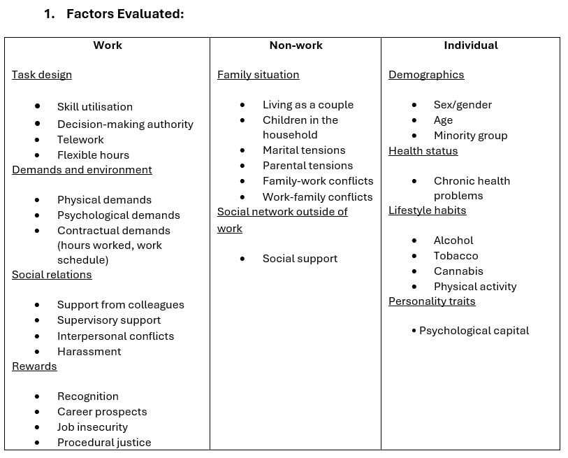 - Observatoire sur la santé et le mieux-être au travail (July 2024). Mental health in Cycle 4: Contribution of work, non-work and individual factors. FLASH Research Collection, Université de Montréal. https://www.osmet.umontreal.ca/flash-recherche-la-sante-mentale-au-cycle-4-contribution-des-facteurs-du-travail-hors-travail-et-individuels/
