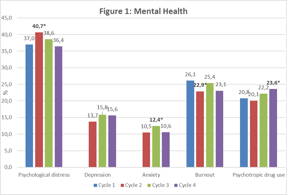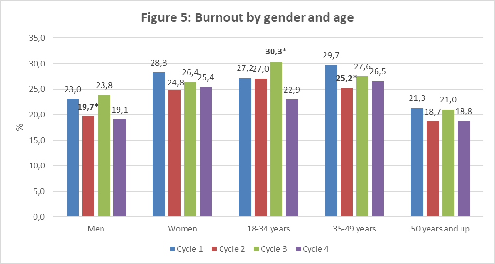 - Burnout decreased in cycle-2 compared to cycle-1 among men as well as among 35–49-year-olds, but it returns to its initial level from cycle-3. Also, the symptoms increased significantly in cycle-3 among 18-34-year-olds compared to cycle-1 but at cycle-4, they return to the level observed for cycle-1;