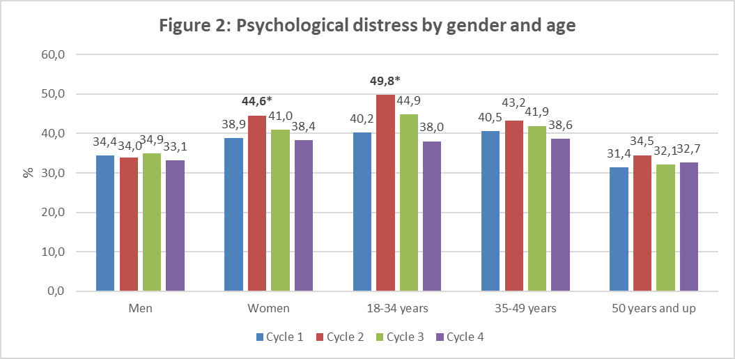 - Distress increased between cycle-1 and cycle-2 among women and 18-34-year-olds, but it returns to the initial level from cycle-3;