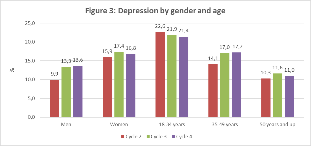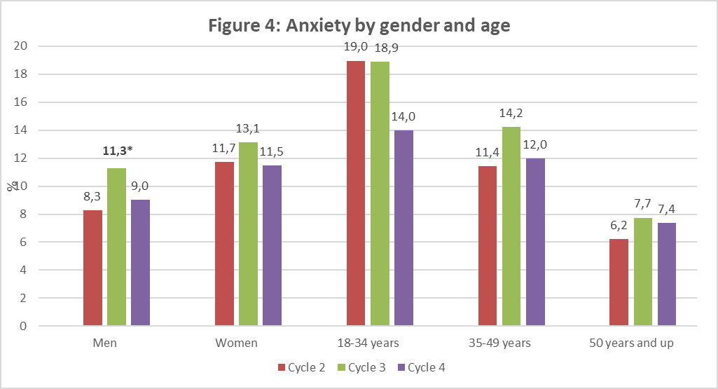 - Anxiety increased in cycle 3 among men, but in cycle 4, it returned to the level observed for cycle 1;