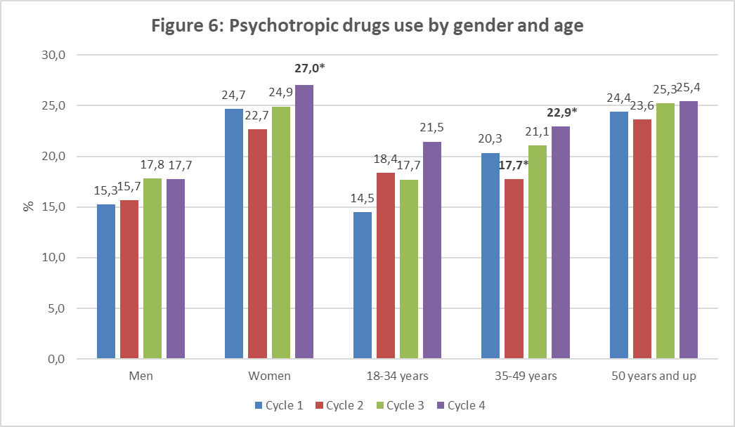 - Psychotropic drugs use decreased in cycle 2 among 35-49-year-olds. However, this psychotropic drugs use increased among women and 35-49-year-olds in cycle 4 compared to cycle 1.